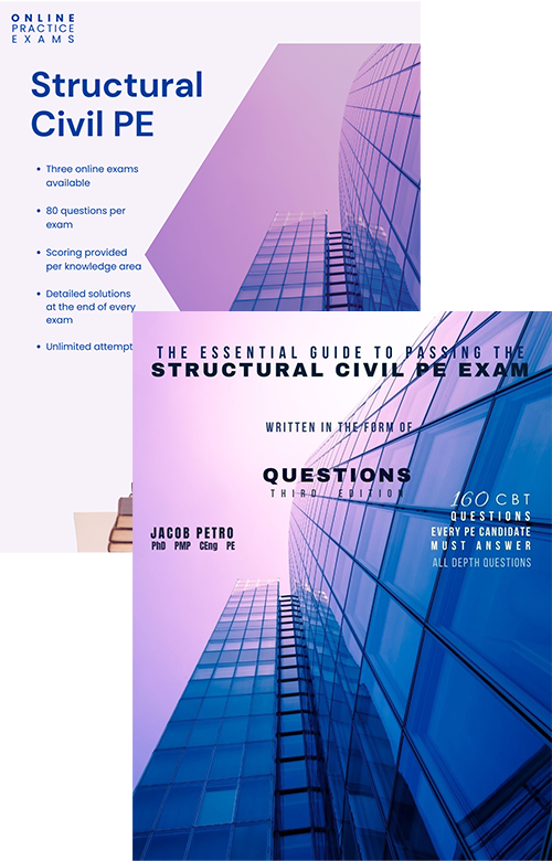The Structural Civil Online Practice Exams have been developed to provide a balanced distribution of question difficulty, along with a representative mix of conceptual and calculation-based problems. These exams cover all major knowledge areas of the Structural Civil PE exam, including, but not limited to, analysis, design, materials, and temporary structures. Each online exam comes with two weeks of access from the purchase date and offers a comprehensive training experience: every problem is explained in detail after you complete your exam attempt, and fully worked, step-by-step solutions are provided with references to the applicable structural manuals and codes. Your performance is also broken down by categories (NCEES knowledge areas), allowing you to identify strengths and weaknesses in each area.