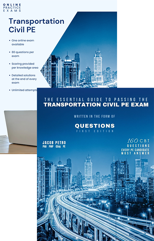 The Transportation Civil Online Practice Exam have been developed to provide a balanced distribution of question difficulty, along with a representative mix of conceptual and calculation-based problems. This exam covers all major knowledge areas of the Transportation Civil PE exam, including, but not limited to, project management, traffic engineering, roadway design, and drainage. This online exam comes with two weeks of access from the purchase date and offers a comprehensive training experience: every problem is explained in detail after you complete your exam attempt, and fully worked, step-by-step solutions are provided with references to the applicable transportation manuals, standards, and codes. Your performance is also broken down by categories (NCEES knowledge areas), allowing you to identify strengths and weaknesses in each area.